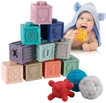 Bloque de apilamiento suave Montessori para bebé, bola sensorial, mordedor para baño infantil, juguetes para apretar con números, formas de animales, frutas y texturas